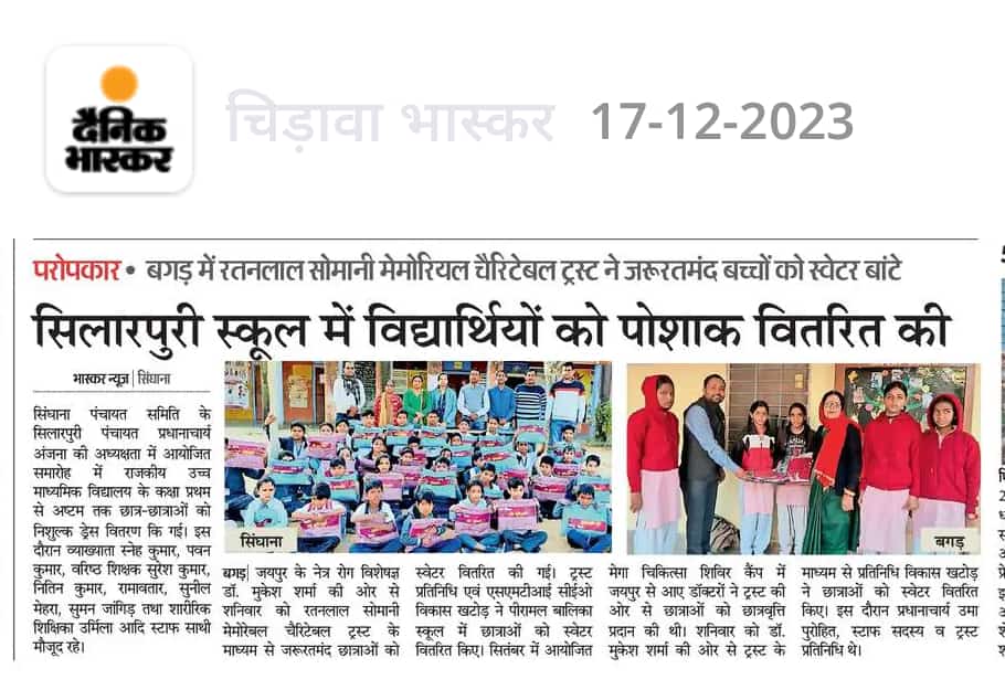 1. 6th Free winter clothes to poor this annual program will be on 24th December at ancestral house of late Ratan Lal Ji Somani at Bagar 50 sweaters will be given by trust.