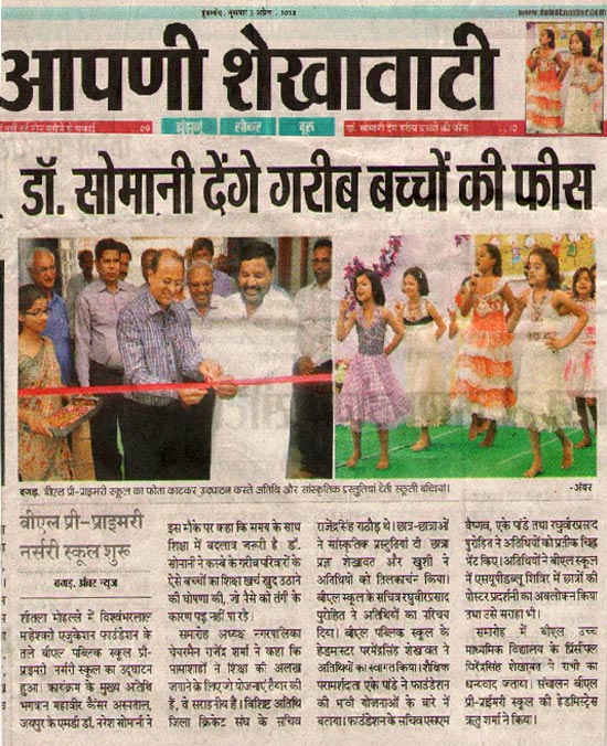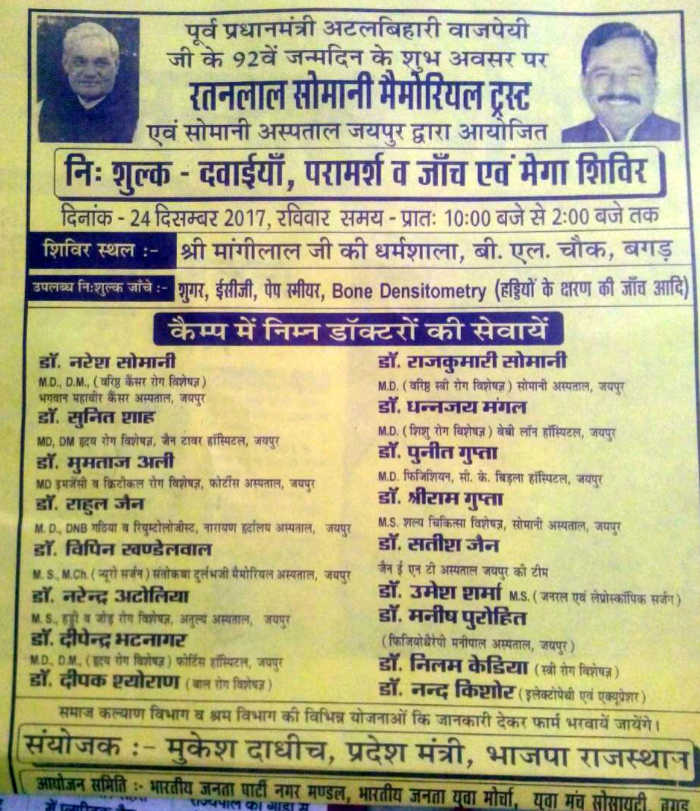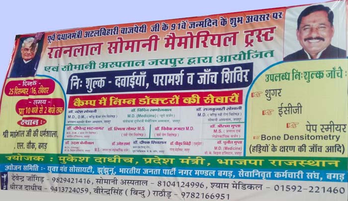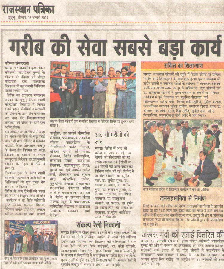 A Mega & Multi-Specialty Free Medical Camp will be held at Bagar on 17.1.2010 at B.L. Maheshwari School. Around 15 Specialist Doctors will give free consultation to all needy patients. Free investigations and medicines will also be given.