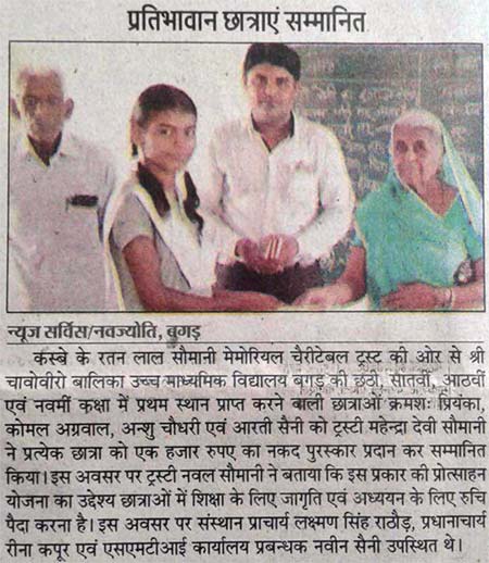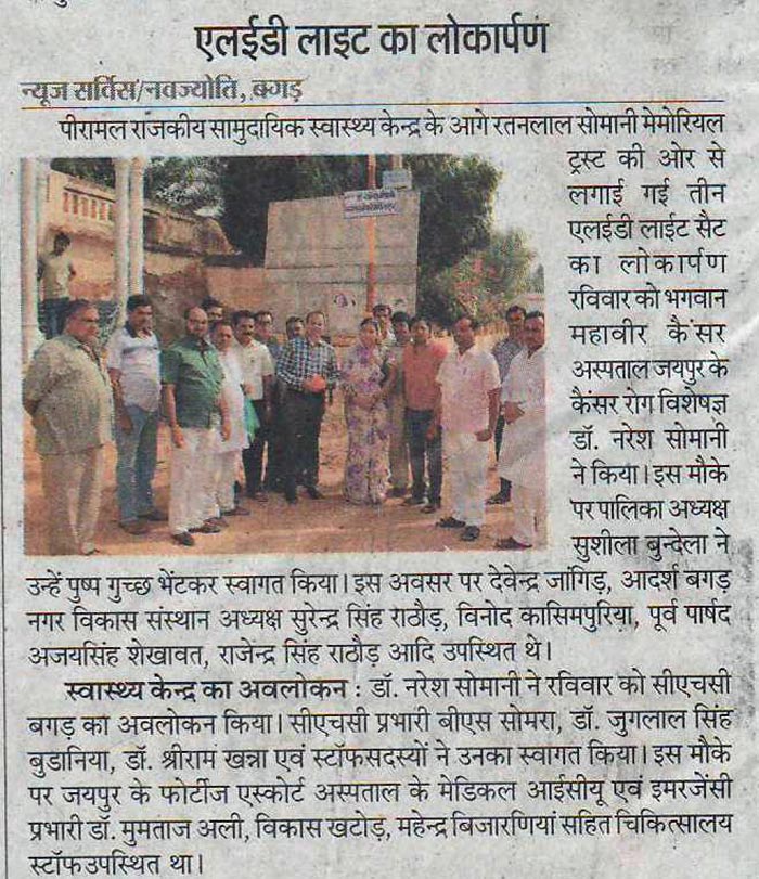 In memory of late Ratan Lal Somani at Bagar Circle (at tiraha bus stand) construction was done along with this a high mast light was also installed. This was done by Dr. Naresh Somani and Dr. Rajkumari Somani.